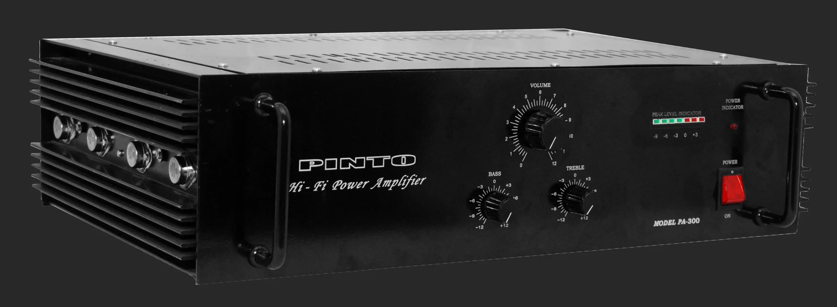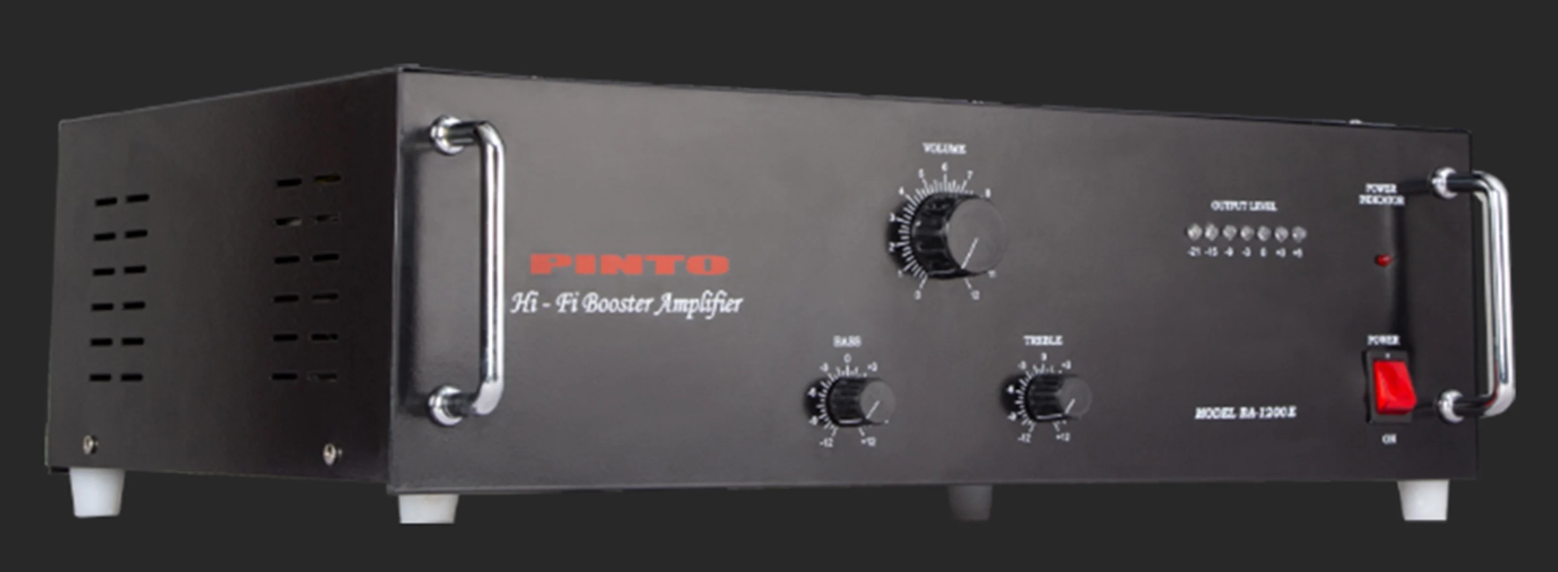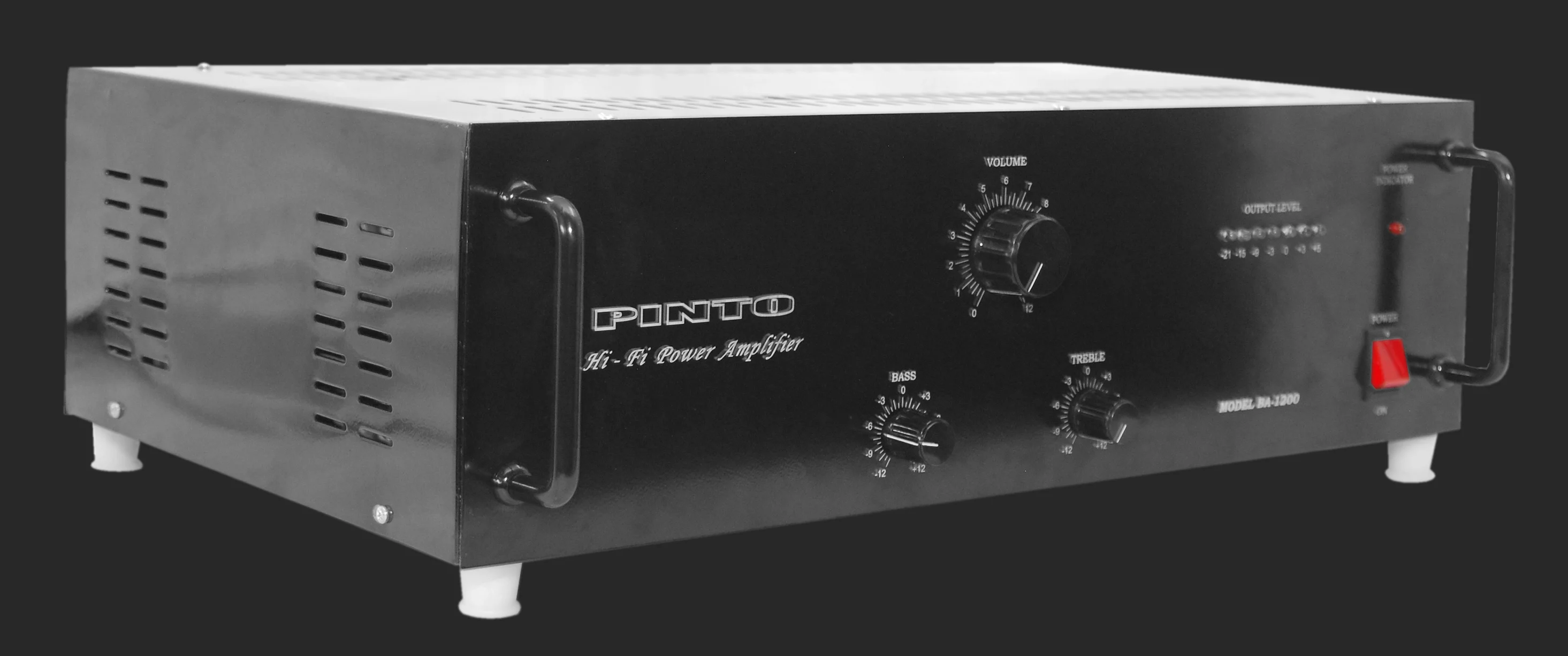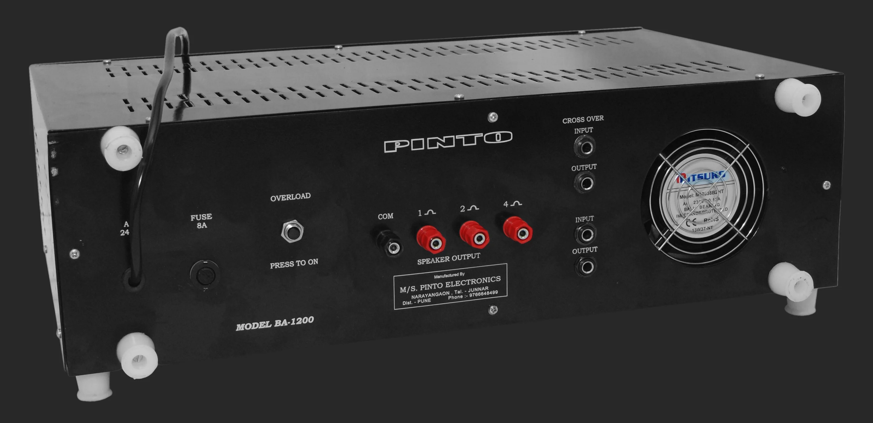 Pinto Hi-Fi power amplifier BA-1200, BA-1200E is a special purpose amplifier design to drive loads up to 1Ω. & also to drive 2 high power woofers up to 1000 watt each at 4Ω. connection. The output circuit is made with high power metal transistor’s fitted on heavy forced air-cooled Al-heat-sink assembly.
